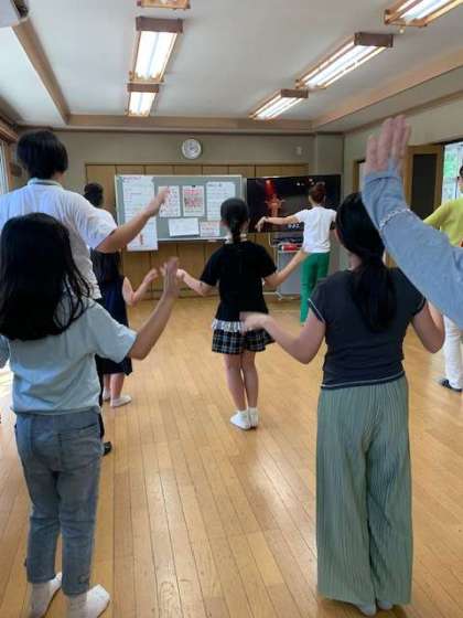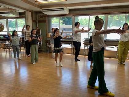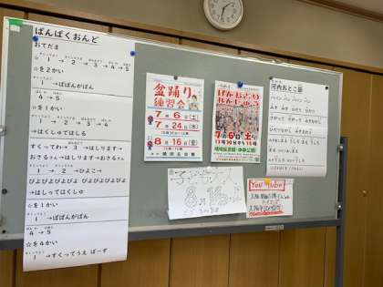 晴明丘中央公園会館で行なわれた盆踊り練習会。 初めての「万博音頭」の練習に挑戦。南の子ども達は、のみこみが早い!地域の先輩方に負けないぐらいに、バッチリ踊れるようになっていました。