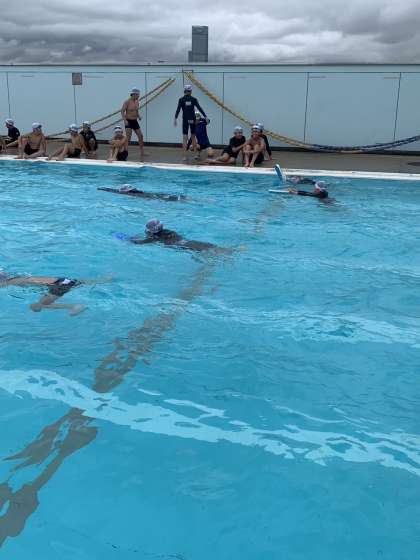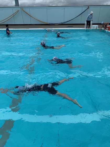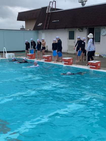 雨が上がったので、5年生、ガンガン平泳ぎの練習をしています。
