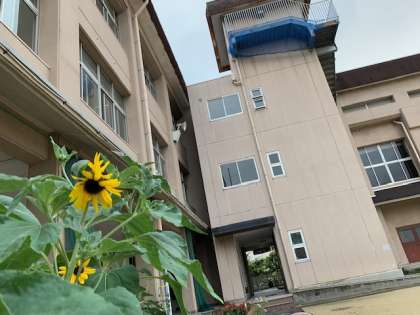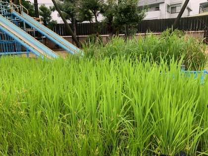 栽培委員会で植えたヒマワリの苗もいつの間にか大輪の花を咲かせ、5年生がJAさんと植えたイネもスクスクと伸びています。