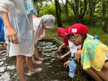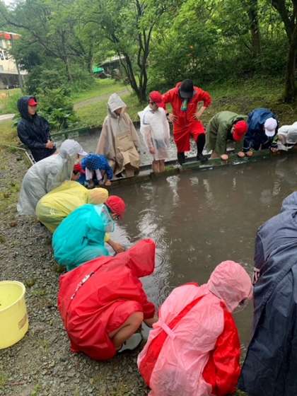 やや雨の中、魚つかみスタートします。