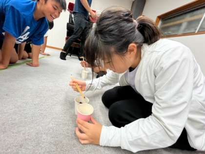 1分間に、お箸で小豆を摘んで紙コップから紙コップへ移せた分だけが得点になります。