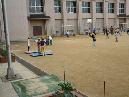 運動場においてあった古いジャンピングボードを、管理作業員さんが新しくしてくれました。子ども達は早速休み時間になると、順番を守って交代で使っていました。