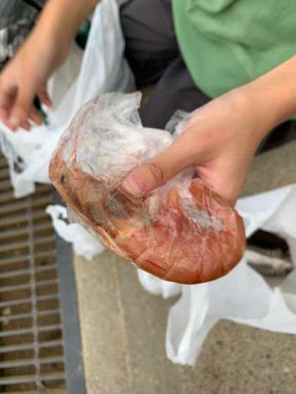 魚介が入った袋を台所の流し場に、そーと置きましょう。