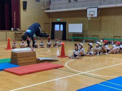 3、飛び越した時、頭を後ろにして両足をしっかり マットにつけて着地する