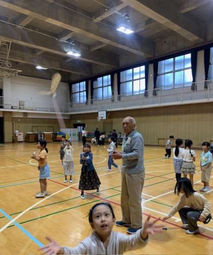 手作りおもちゃのぶんぶんゴマやストロートンボは大人気。会長さんの飛ばすストロートンボは、高く舞い上がり、子ども達も驚いていました。