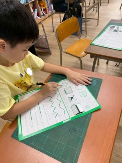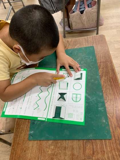 練習用の紙で、カッターナイフの使い方を学習します。どの子も慎重です。