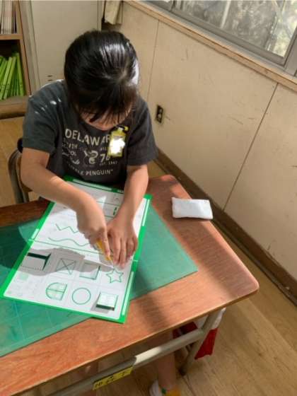 難しい星型の形を切る時は、紙を動かして一つ一つの線を丁寧に切っていくと、上手く形が切り抜けますね。先生の話をしっかりと聞いて、丁寧にカッターナイフを動かしている子ども達に感心しました。