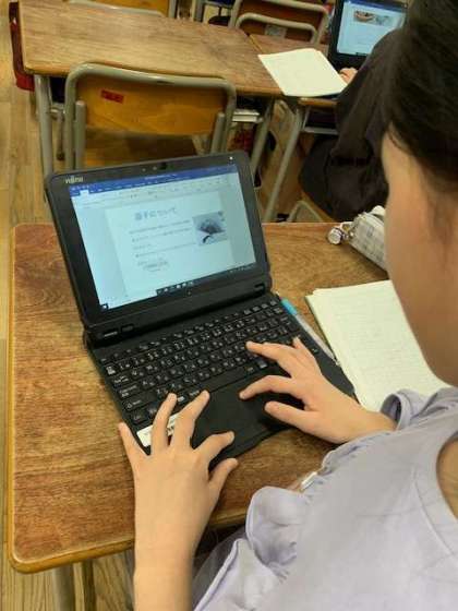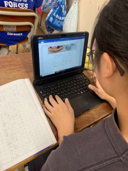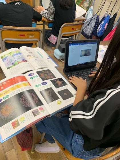 国語。和の文化の説明文を学習した後の発展的な学習として、自分が興味を持った和の文化を調べ学習で深め、PCでまとめていきます。