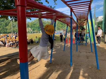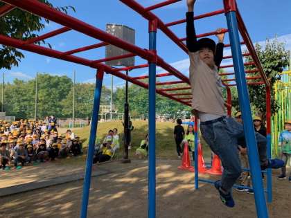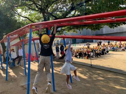 こちらも学級の代表児童が、真新しいはしご状の遊具に手をかけます。