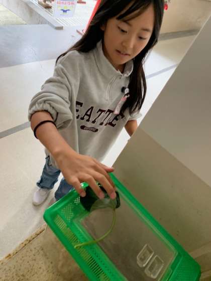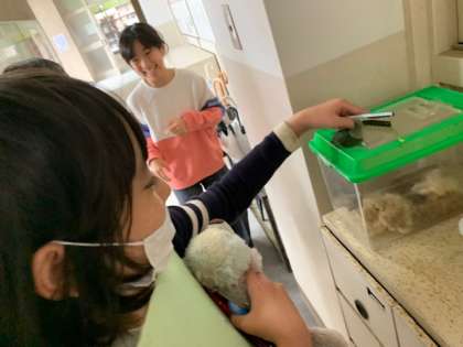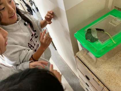 休み時間、職員室前でのジャンケン対決の声があまりに賑やかなので、覗いてみると、ジャンケンで負けた人が、イモムシをツンツンするという熱戦が繰り広げられていました。