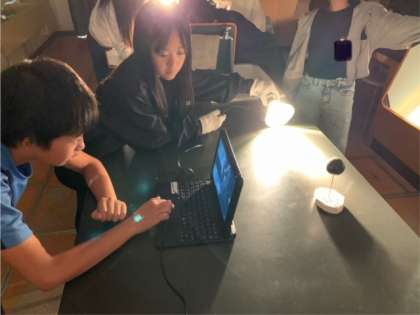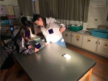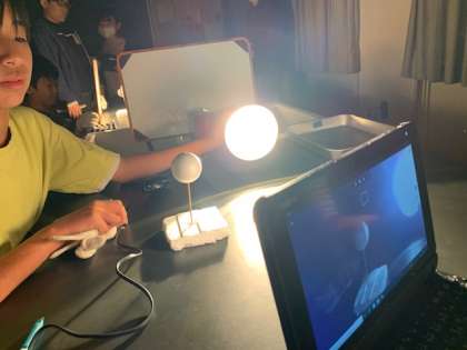 で、ライトと発泡スチロール球をそれぞれ太陽と月に、カメラを地球に見立て、月が地球周りを公転するさまを撮影しました。