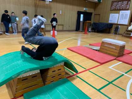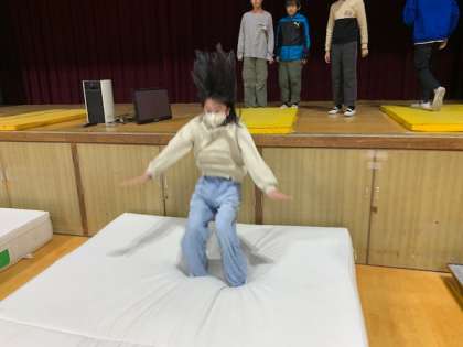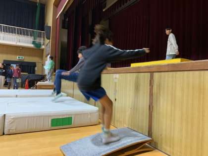 綺麗な台上前転に必要なのは、高いジャンプと高い位置からのしっかりとした着地です。