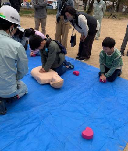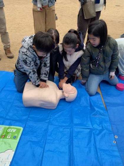 心臓マッサージのエリアでは、両手を重ねてリズムよく、ベストポイントを押すのが難しく、子ども達は四苦八苦していました。「力いるなぁ〜」「あっ!音なった!」「これで、人の命が救える!」373防災キッズの真剣な取り組み方に、地域の方々も感心していました。
