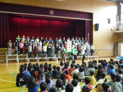 終業式の学年発表は1年生と5年生がしました。5年生は、桃太郎を英語劇で行いました。セリフが英語で、全身を使って表現していました。最後に英語で桃太郎の歌を歌いました。