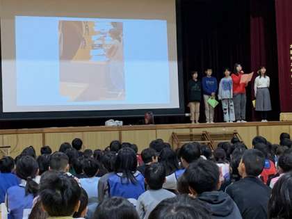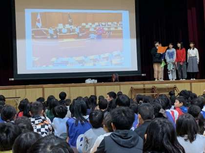 この夏、おおさか子ども市会の参加に応募した6年生と実際に参加した6年生が、市会の説明や市会で意見したこと、提案したこと等について報告しました。