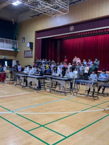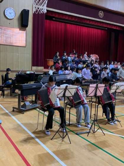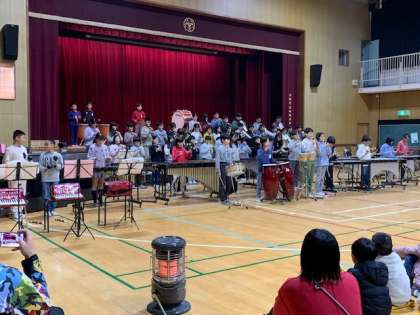 お次は、5年生。コンガやボンゴ、ティンパニなどの多彩な打楽器も加わりました。人数も多いので、大迫力の演奏になり、みんなは驚いていました。軽快なリズムが心地よく、真剣な表情の5年生に大きな拍手が贈られていました。