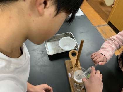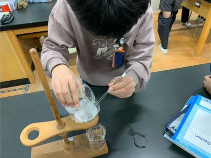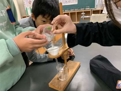 濾紙のたたみ方、漏斗へのセットの仕方、漏斗の先端とビーカー壁面の接着、注ぎ方等々、配慮事項がとても多い濾過。