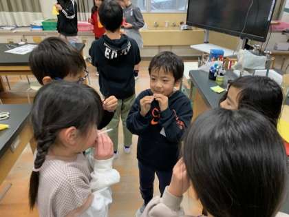 ストローの先を山型に切り取りリードを作り、口に咥えて上手く吹けば、面白いほど「プー! プー! プー?」