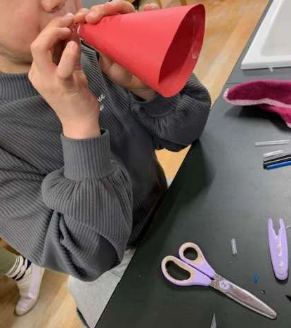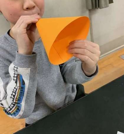 慣れてきたところで、画用紙で笛先を覆えば、トランペットに様変わり。