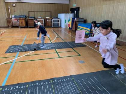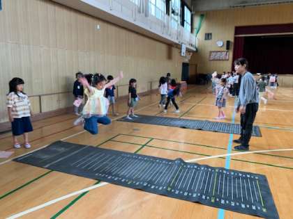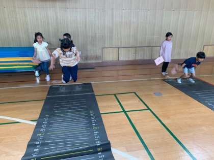 腕をしっかりと振りながら、立ち幅跳びの練習に余念がありません。
