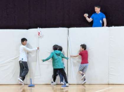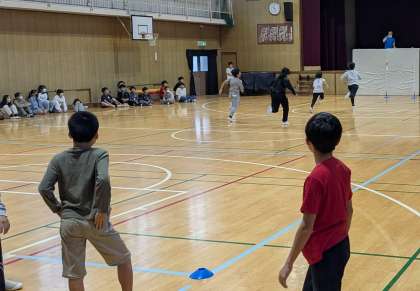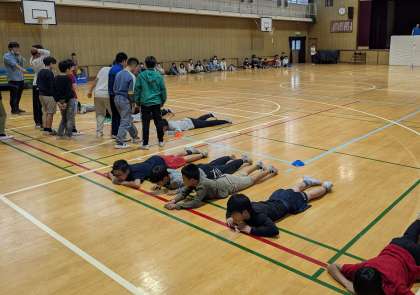体育の時間に講堂で、浜辺でやる予定にしていたビーチフラッグスをしました。ライフセーバーのようにはいきませんが、盛り上がっていました。