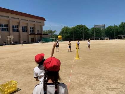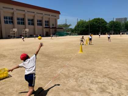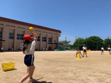 3年生が、体力テストのソフトボール投げに備えて、特訓中です。