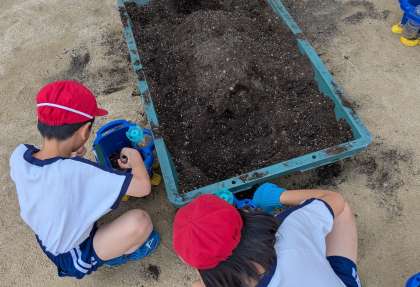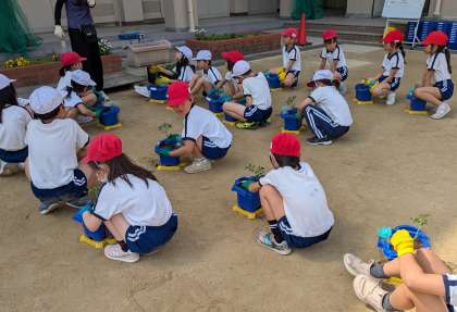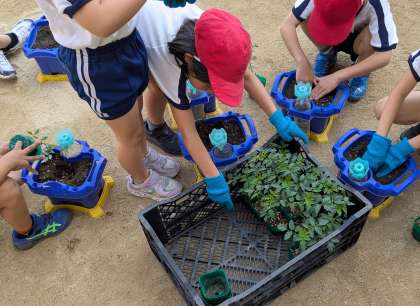 2年生がミニトマトを一人ずつ植えました。しっかり世話をして、たくさん実がなるといいてすね。