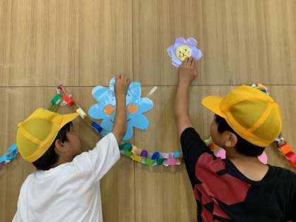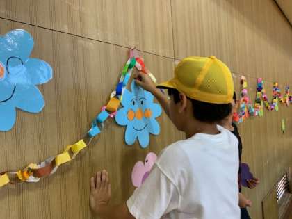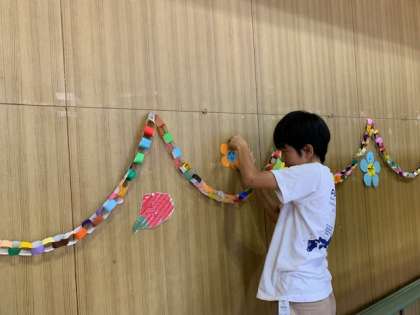 講堂の壁面掲示の仕上げです。