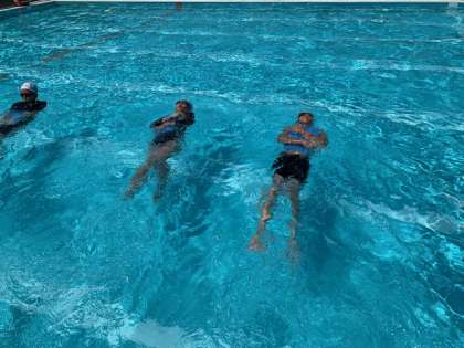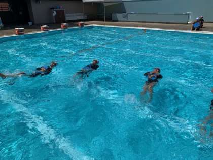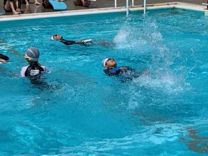6年生がビート板を胸に抱えて、背浮きの練習。