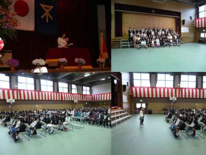 平成28年度の入学式が、雨の中行われました。52名の新1年生が入学してきました。歌と呼びかけで2年生が、入学をお祝いしました。