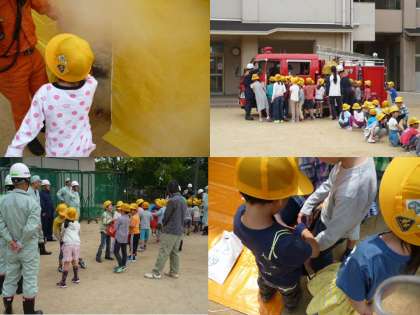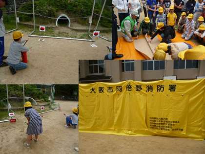 運動場では、防災訓練をしました。低学年は『バケツリレー』『煙テント体験』『応急処置』『消防車見学』、高学年は『煙テント体験』『水消火器での消火訓練』『応急処置』『簡易担架作成』をしました。