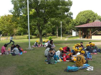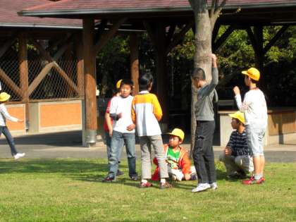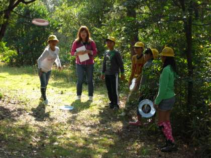 午前中は、グループに分かれてフリスビーゴルフをしました。フリスビーが初体験の児童もいましたが、ゲームが進むにつれて、思うように投げられる場面も増えているようでした。お互いに教えあっている場面はとてもほほえましく感じました。午後は、芝生広場で元気いっぱい仲良く遊びました。秋晴れのもと、自然の中で楽しく過ごすことができました。