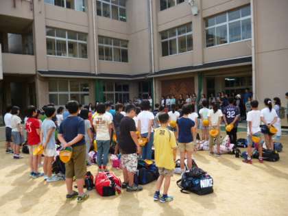 今日から3日間、6年生は自然体験で琵琶湖青少年の家へ行きます。子どもたちは大きな荷物を持って、出発式をした後、バスに乗り込んでいきました。