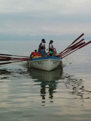 無事午後のプログラム、カッター訓練を終えて戻ってきました。始めは、櫂をうまく合わせて動かすことができなかったのですが、心をひとつにしてがんばりきることができました。この後、少し休憩(ジュースを飲みます)をして、お風呂に入り、夕食の準備をします。