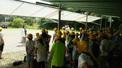 やはり、暑くなってきました。昼食を終えて、今日から3日間お世話になる角野山荘で開舎式をおこないました。この後部屋割りをして、焼き板工作をする予定です。