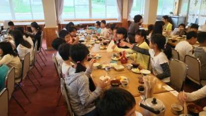 朝の集いを終えて、食堂でライフリーダーが朝食の配膳をします。朝からみんな食欲旺盛です。この後、鉢伏山を目指して山登りをします。