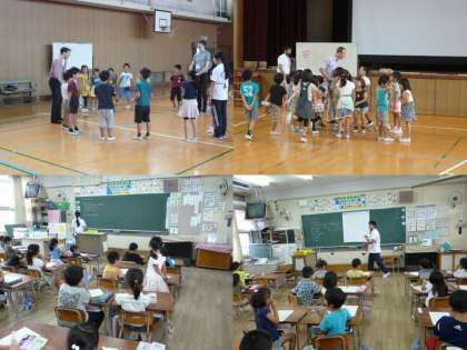 一日フリー参観の様子です。2時間目は「阿倍野区子ども英語力向上サポート事業」として、区役所から講師を派遣してもらい、講堂で学習をしました。5時間目は、生活科の学習をしました。