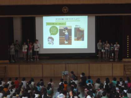 児童集会で、美化委員会の発表がありました。今回は、ほうきの正しい使い方を画像を使って説明しました。実際に舞台の上で実演もしていました。