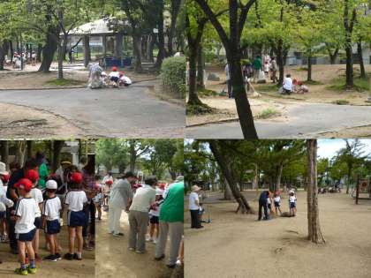 1年生は、晴寿会の方と一緒に中央公園のそうじをしました。地面に落ちている落ち葉を一緒に集めて、袋につめてそうじをしました。