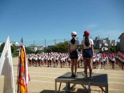 今日は、全校練習で運動会の開会式の練習をしました。校旗、優勝旗、準優勝盾を先頭に入場の練習をしました。