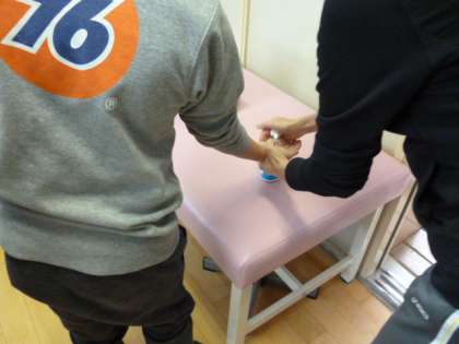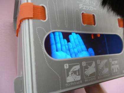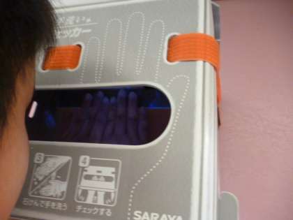 手洗い指導では、石鹸を付けてきれいに洗うときれいになることが、特殊なライトを使うことでよくわかりました。