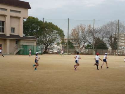 6年生は、体育で持久走でに取り組んでいます。毎回、一周ごとのタイムを計測して、前回よりも少しでも良くなるように頑張っています。