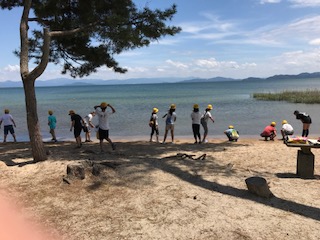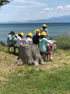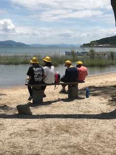 湖畔の爽やかな風のもと、活動班のみんなで弁当を食べました。