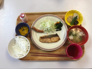 焼塩鮭、ウインナー、煮物、サラダの朝食です。