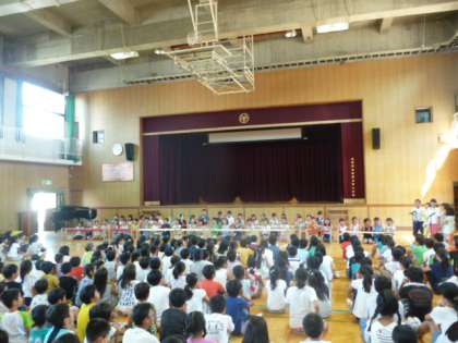 終業式の後、3年生が学年発表をしました。阿部野神社の『太鼓体験』を実演しました。