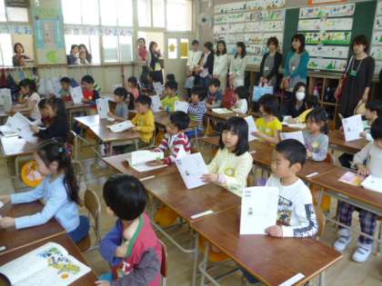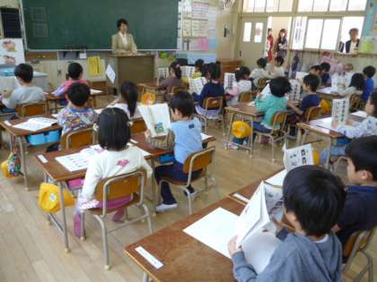 児童は、保護者の方に見つめられ、緊張した様子で授業を受けていました。