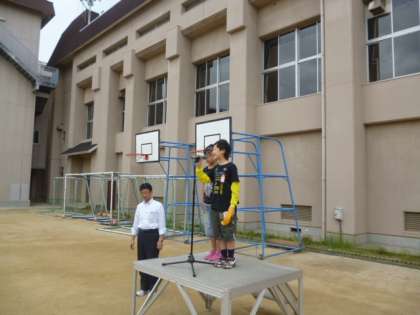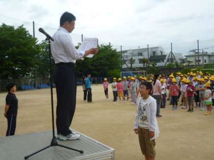 本日5月26日(月)の児童朝会では、6年生のあいさつの後、校長先生のお話しの時に昨日行われた相撲大会の表彰がありました。5年生の部で優勝した人が代表して賞状を受け取りました。