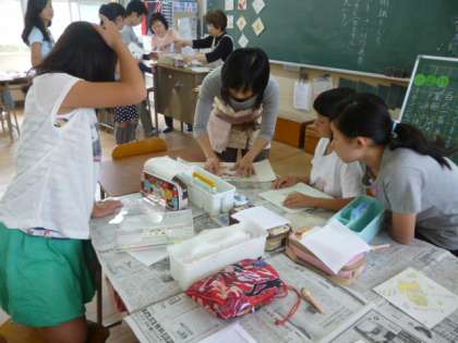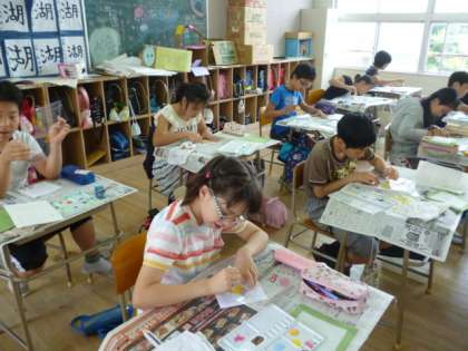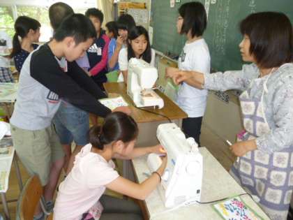 5月29日(木)6年生が地域のキルトクラブの方にお越しいただき、ステンシルを体験しました。自分で選択した型に絵の具で色付けをして、アイロンで台紙に貼り付け、ミシンで仕上げました。色付けのコツなど丁寧に教えていただき、良い作品ができました。