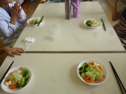 家庭科の調理実習をしました。今回は、「ゆで野菜サラダ」を作りました。