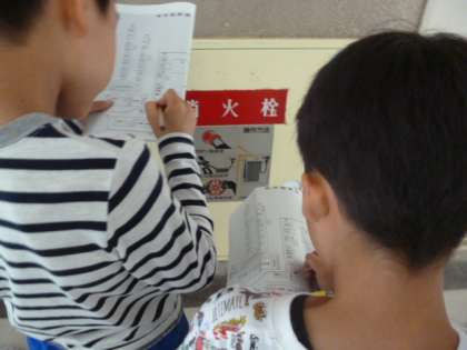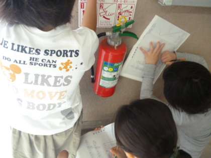 各グループに分かれて、消防設備(消火器・防火バケツ・消火栓・火災報知器・防火とびらなど)がどこにあるのか探してきました。
